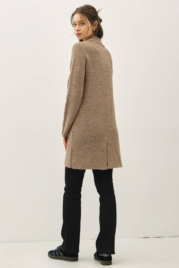 This knee-length open coatigan is where cozy meets chic. With its double-breasted button detail, notched collar, and long sleeves, it’s polished enough for holiday gatherings yet comfy enough for everyday wear. Front patch pockets keep your essentials close, while the back slit adds just the right touch of movement. Layer it over sweaters, tees, or dresses for instant fall-to-winter style—your new go-to for coffee dates, office days, and everything in between.